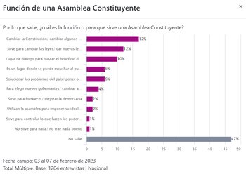 Por otro lado, la ciudadanía también fue consultada sobre el objetivo de una asamblea constituyente. A los entrevistados se les interrogó de la siguiente manera: “¿Cuál es la función o para qué sirve una asamblea constituyente?”.