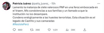 “Mi más sentido pésame a las familias y amigos de los valerosos policías que fueron cobardemente emboscados por terroristas en el centro poblado de Natividad, en el #Vraem. Estas muertes no pueden quedar impunes. #TerrorismoNuncaMás”, escribió en su cuenta de Twitter.
