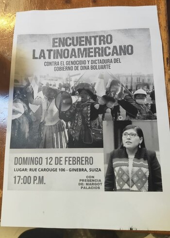 Un afiche difundido por su colega Juan Carlos Lizarzaburu (Fuerza Popular) dio cuenta que la legisladora estaría en Europa para participar del Encuentro Latinoamericano contra el genocidio y la dictadura de Dina Boluarte. Este evento se habría realizado ayer en el Rue Carogue 106 en Ginebra, Suiza. La legisladora fue anunciada como expositora.
