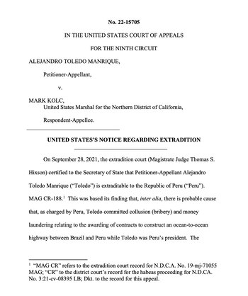 Toledo, detenido en julio de 2019 por acusaciones de corrupción y bajo prisión domiciliaria en ese país, reside en el país norteamericano tras dejar la presidencia, salvo por un paréntesis en 2011, cuando se postuló en las elecciones presidenciales para un segundo mandato (fue derrotado en primera vuelta).