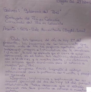 En la misiva, se expresa el malestar de los pasajeros, pero sobre todo la preocupación, pues son un gran número de peruanos que no cuentan con el apoyo económico para permanecer en el país colombiano.
