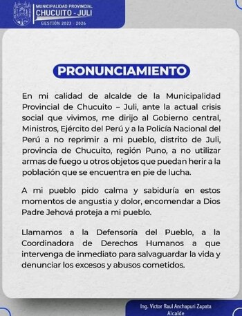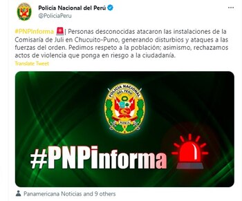 La Policía Nacional del Perú (PNP) informó lo siguiente: “Personas desconocidas atacaron las instalaciones de la Comisaría de Juli en Chucuito-Puno, generando disturbios y ataques a las fuerzas del orden. Pedimos respeto a la población; asimismo, rechazamos actos de violencia que ponga en riesgo a la ciudadanía”-