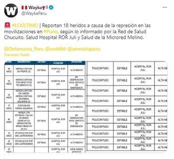La Red de Salud Chucuito, Salud Hospital ROR Juli y Salud de la Microred Molino informaron que son, en realidad, 18 heridos a causa de la represión en las movilizaciones de esta jornada en Puno.