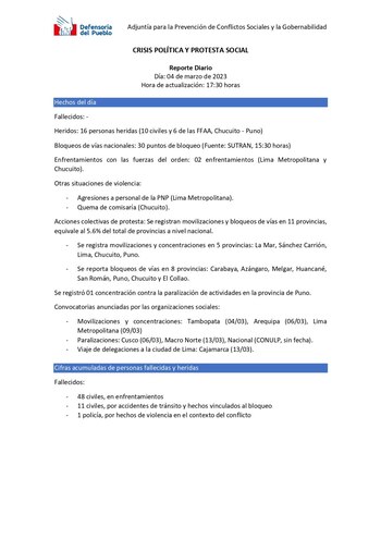 Según el último reporte de la Defensoría del Pueblo, son un total 16 heridos (10 civiles, 6 efectivos FF. AA.) en Chucuito. Los enfrentamientos con las fuerzas del orden se han registrado en Lima y en la localidad puneña, donde además hubo una quema de comisaría. El organismo también informó de 30 puntos bloqueados.