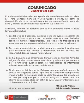 “El Ministerio de Defensa lamenta profundamente la muerte de los cabos del EP Franz Canazas Cahuaya y Alex Quispe Serrano, así como la desaparición de otros tres integrantes nuestro ejército en el río y lave que expresa su absoluta solidaridad con sus familiares”, inicia dicho comunicado.