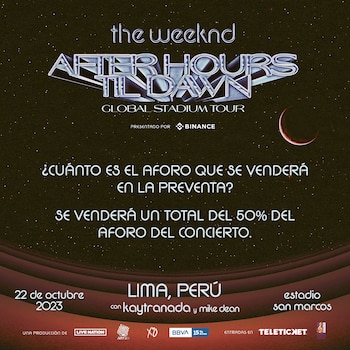El intérprete de ‘Save your tears’ llega como parte de su exitosa gira mundial, ‘After Hours til dawn tour’, que incluye 43 fechas, con paradas en Europa y América Latina. Esta es la primera vez que los fans peruanos de The Weeknd podrán disfrutar de dos de los discos más exitosos de su carrera, ‘After Hours’ (2020) y ‘Dawn FM’ (2022) en vivo.