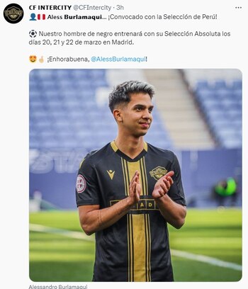 “Aless Burlamaqui… ¡Convocado con la selección de Perú! Nuestro hombre de negro entrenará con su selección absoluta los días 20, 21 y 22 de marzo en Madrid. Enhorabuena Burlamaqui”, posteó en su cuenta oficial de Twitter CF Intercity.