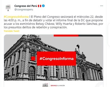 El próximo miércoles 22 de marzo, desde las 16:00 horas, el pleno del Congreso sesionará para debatir y votar el informe final de la denuncia constitucional que propone acusar a Betssy Chávez, Willy Huerta y Roberto Sánchez, exministros de Pedro Castillo, por los presuntos delitos de rebelión y conspiración.