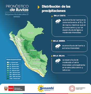Del 16 al 22 de marzo se prevé lluvia fuerte. En la zona norte entre el 18 y 19 de marzo, mientras que en la costa centro y sur se espera lluvia de ligera a moderada intensidad. Asimismo, en sierra se prevé lluvia de fuerte a extrema intensidad.