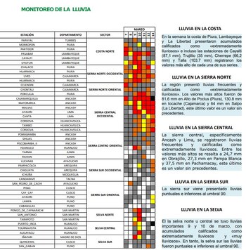 En la semana la costa de Piura, Lambayeque y La Libertad presentaron acumulados calificados como «extremadamente lluviosos» e incluso las estaciones de Cayalti (87,1 mm), Trujillio (35 mm), Cherrepe (66,2 mm) y Talla (103.7 mm) registraron los valores más alto de cada una de sus series