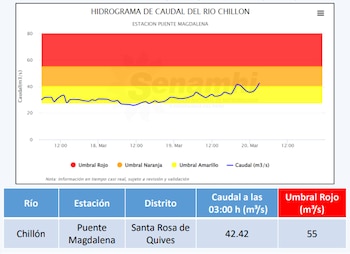 De acuerdo al monitoreo constante que realiza el Servicio Nacional de Meteorología e Hidrología del Perú (Senamhi) al comportamiento hidrológico de los ríos, el caudal del río Chillón reportó un caudal de 42.42 m3/s en la estación hidrológica Puente Magdalena, en el distrito de Santa Rosa de Quives, ubicándose en el umbral naranja, ante el riesgo de desbordes.