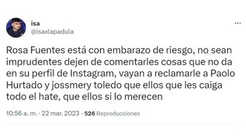Los mensajes de solidaridad no se hicieron esperar. A través de las redes sociales, los usuarios la alentaron a que siga adelante y que se enfoque en su tercer embarazo. Mientras que para Paolo Hurtado tuvieron palabras de reproche, por no respetar a su familia.