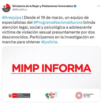 Al respecto, el MIMP solicitó a la Fiscalía y a la Policía Nacional máxima celeridad en el proceso de investigación en este caso. Asimismo, solicitó a la municipalidad de Arequipa a fiscalizar el hospedaje.