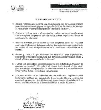 Entre las interrogantes que el titular de la cartera de Educación tendrá que responder se encuentra que deberá explicar por qué dijo que las mujeres aimaras “alquilan a sus hijos”, qué acciones está realizando su despacho para resarcir sus comentarios discriminatorios, si se encuentrra implementando programas con enfoque intercultural que combata la discriminación étnica y racial, si están contratando docentes de educación bilingüe en las regiones, y si trasladaron material educativo a la ciudad de Puno para el inicio del año escolar.