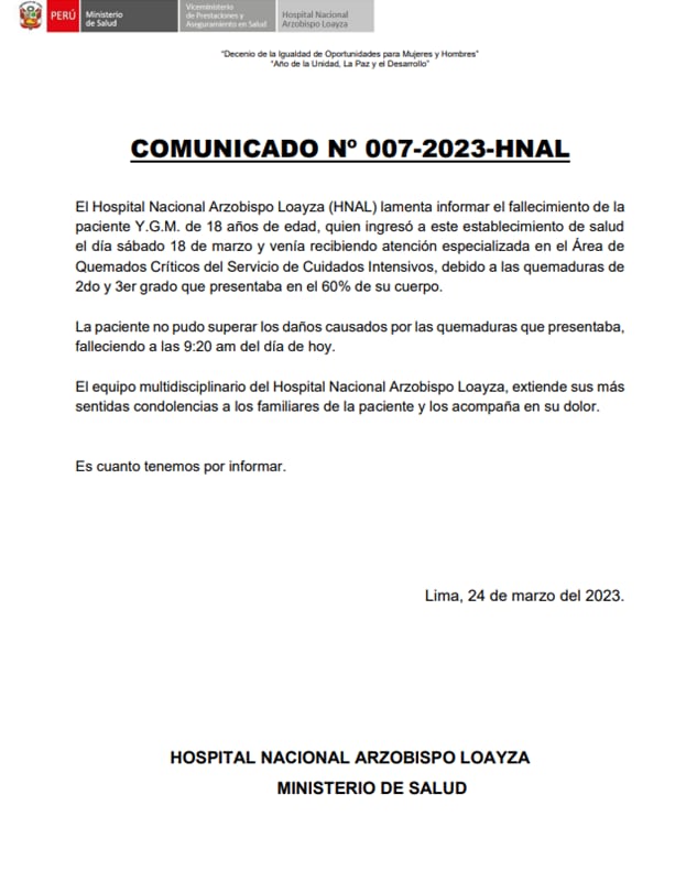 Respecto a la libertad del supuesto agresor, Tolentino aseguró que el Ministerio de la Mujer trabaja junto con la cartera del Interior para encontrar al agresor. “Un poco de consuelo va a llevar a la familia saber que este esté sancionado y pague por el delito que ha cometido”, expresó.
