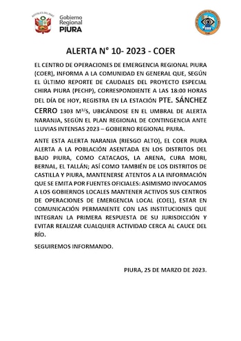 Con 1303 m3/s en el Puente Sánchez Cerro, el río Piura en el umbral de alerta naranja. En ese sentido, el COER - Piura pide a la población del bajo Piura y distritos de Piura y Castilla mantenerse atentos.