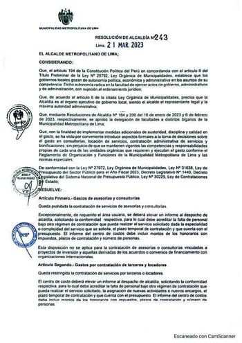 La medida está establecida en la Resolución de Alcaldía N° 243. “Cuidamos los fondos públicos de la ciudad”, señaló la comuna a través de su cuenta de Twitter. El alcalde añadió que la iniciativa forma parte de la política de austeridad que impulsa su gestión para hacer “uso eficiente de recursos”.