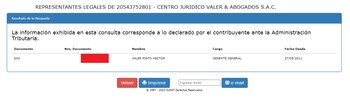 En otro momento, el parlamentario refirió que conversáramos con el representante legal de esas empresas. Le preguntamos por el nombre. “Aparece en la Sunat”, respondió. Le hicimos caso y vimos que su nombre aún aparecía como gerente general del Centro Jurídico Valer & Abogados S.A.C.