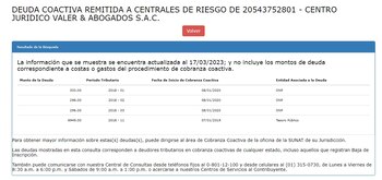 El Centro Jurídico Valer & Abogados S.A.C. inició actividades el 9 de junio de 2011. Sin embargo, solo se mantuvo hasta el 31 de octubre del 2018 cuando su estado contribuyente pasó a ser “baja de oficio”. Pese a su nuevo estatus, no obstante, al 17 de marzo pasado mantenía una deuda de S/ 7 843. Esta cifra corresponde por concepto de la Oficina de Normalización Previsional (ONP) y la restante al Tesoro Público.