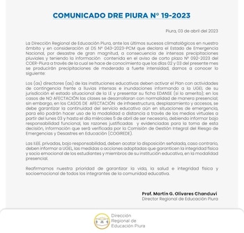 Luego de que se registraran las fuertes precipitaciones en esta localidad, la Municipalidad de Piura emitió un comunicado, expresando que se suspenderán las clases presenciales como una medida de salvaguardar la integridad de los maestros, alumnos y personal administrativo.