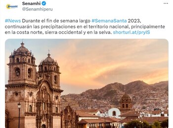 El Servicio Nacional de Meteorología e Hidrología (Senamhi) compartió este miércoles el pronóstico del tiempo para la Semana Santa 2023. Según el organismo, desde este Jueves Santo al Domingo de Resurrección, las precipitaciones (lluvia/nieve/granizo) continuarán dentro del territorio nacional, principalmente en la costa norte, sierra occidental y en la selva.