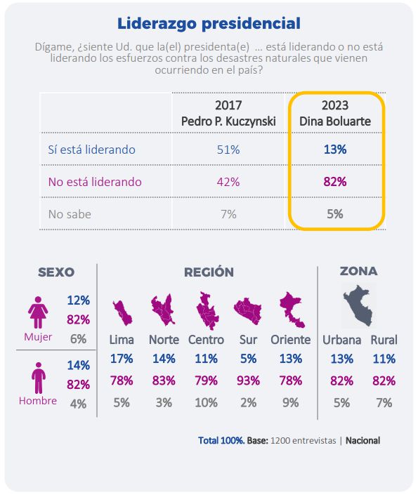 Tras una consulta realizada a la ciudadanía a nivel nacional, desarrollado por la encuestadora Datum, un 82% de la población manifestó que la presidenta Boluarte “no lidera los esfuerzos contra los desastres naturales que vienen ocurriendo en el país. Un 13% señaló lo contrario, mientras tanto, y un 5% evitó responder.
