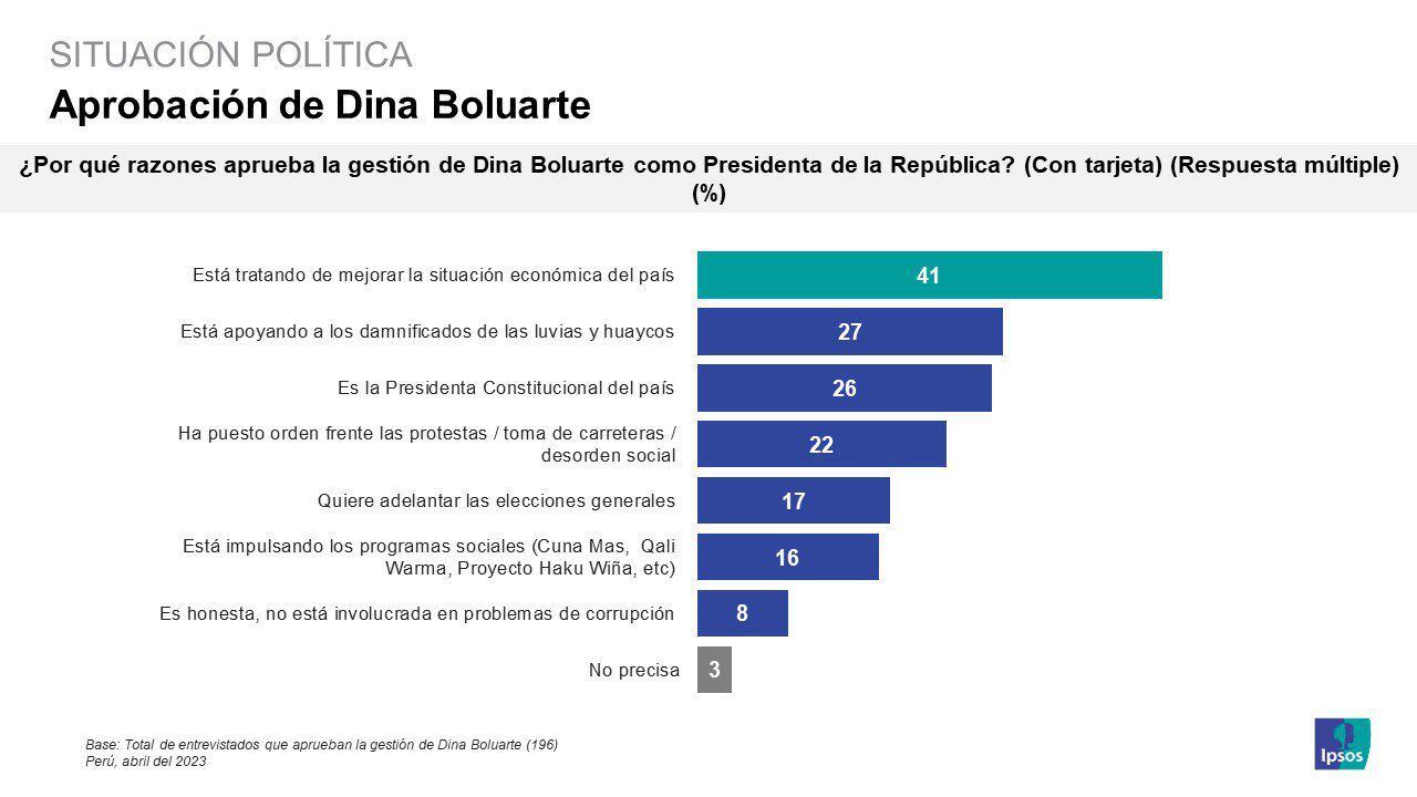 Otras causas es porque no maneja bien las protestas sociales (38%), estar involucrada en actos de corrupción (31%) y no está apoyando a los damnificados de las lluvias y los huaicos (30%), quiere quedarse en el gobierno/no desea el adelanto de las elecciones (28%), traicionó a Pedro Castillo/aliada del Congreso (27%) y no apoya a los pobres (22%).