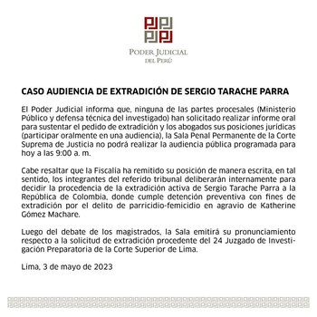 “Se decidirá la procedencia de la extradición activa contra Sergio Tarache Parra a la República de Colombia, donde cumple detención preventiva con fines de extradición por el delito de parricidio femicidio en agravio de Katherine Gómez Machare”, puntualizaron.