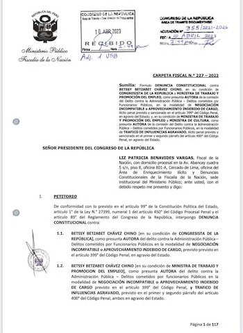 La Subcomisión de Acusaciones Constitucionales del Congreso aprobó este martes admitir a trámite la denuncia constitucional contra Betssy Chávez, exministra de Trabajo y Promoción del Empleo, por supuestos contratos a allegados para cargos públicos.