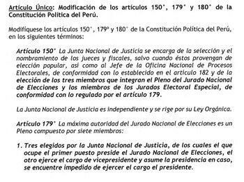 Por otro lado, el Proyecto de Ley N° 3961 “Ley de Reforma Constitucional que otorga transparencia y neutralidad al JNE” busca modificar los artículos 179° y 180 de la Carta Magna.