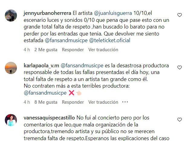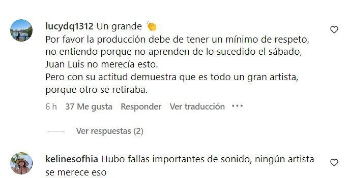 “Gracias a Dios que es un tremendo artista y no se fue, qué pena esa producción. Juan Luis Guerra estuvo espectacular”, “No puede fallar el sonido”, “Qué pena que pase esto con un grande, total falta de respeto, han buscado lo barato para no perder por las entradas que tenían que devolver. Me siento estafada”, se lee en la plataforma.