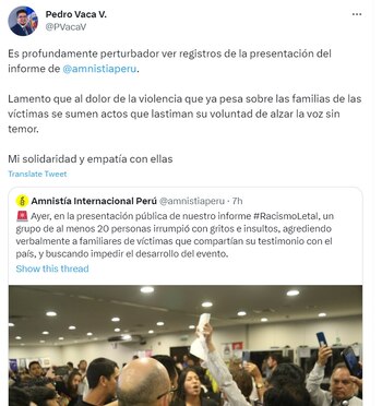 Pese a que los radicales manifestantes vociferan que “en Perú no existe el racismo”, este es uno de los hallazgos del informe de Amnistía internacional. Es por ello que entre las recomendaciones más urgentes, piden a la presidenta “que condene y ponga fin al uso de la fuerza letal por parte de los cuerpos de seguridad para responder a las protestas, así como que lleve a cabo una evaluación urgente del racismo estructural que parece permear el actuar de las instituciones del Estado peruano”.