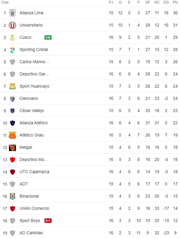 Tabla de posiciones de la Liga 1