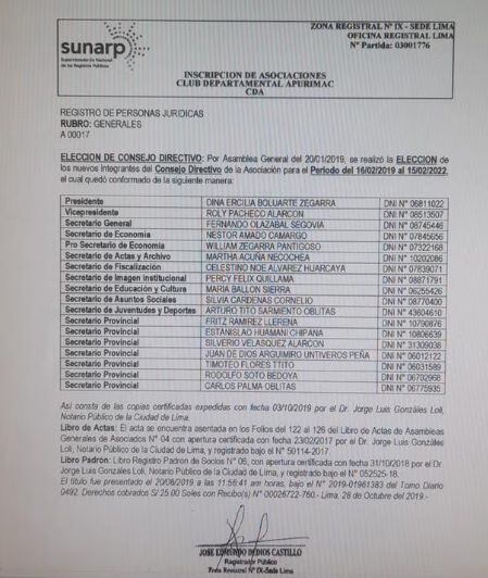 Según el diario Perú 21, Boluarte Zegarra se mantiene como presidenta del Club Departamental Apurímac. De acuerdo a la partida N° 03001776 inscrita en la Superintendencia de Registros Públicos (Sunarp), la mandataria seguirá en este puesto hasta el próximo 15 de febrero de 2024. Su mandato inició en 2019 y prolongó su gestión hasta el próximo año.
