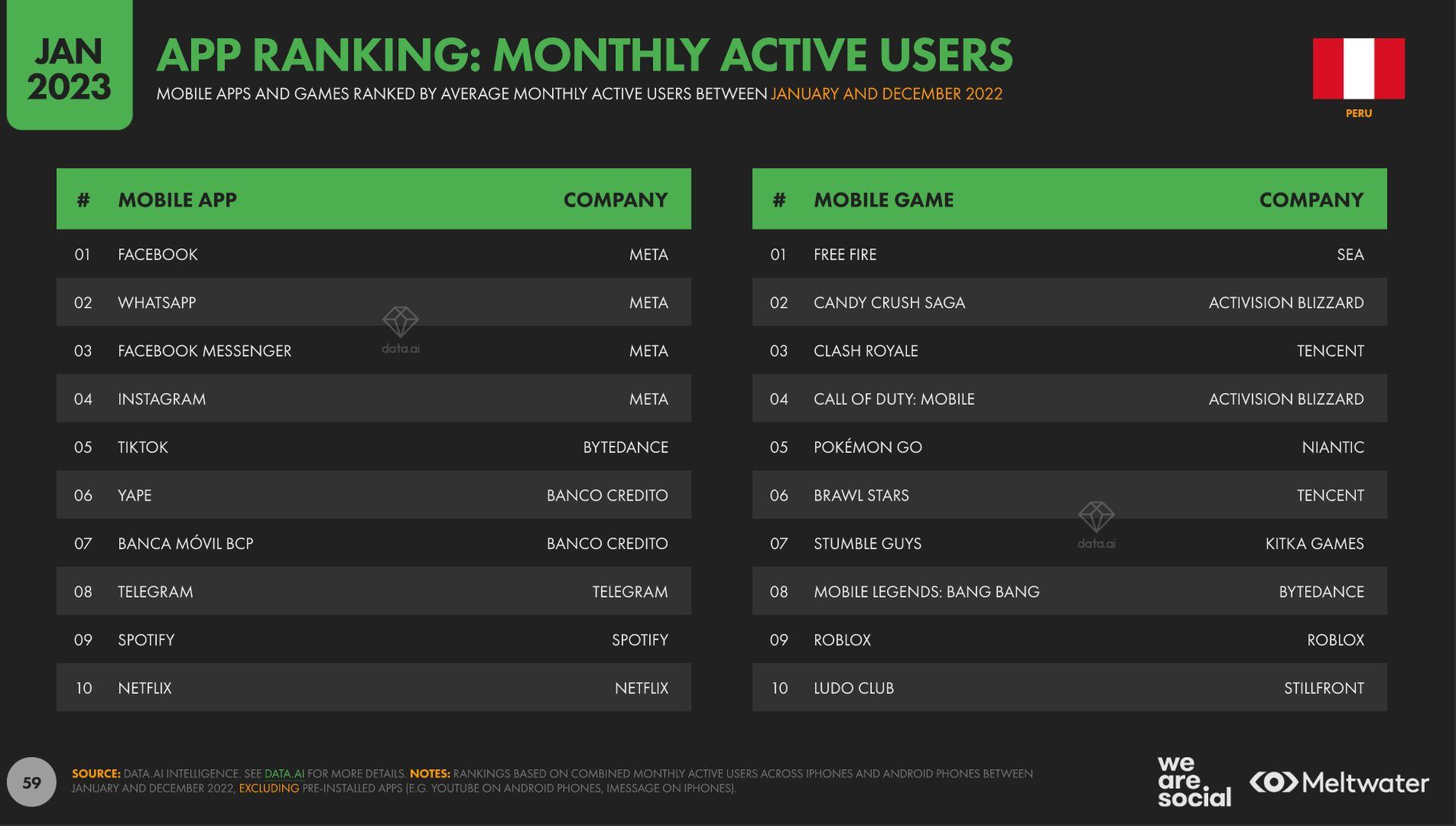 Ciertamente, estas cifras también son apalancadas por la penetración que existe del aplicativo a nivel local. Según el estudio anual We Are Social, en Perú las conexiones móviles superaron los 40 millones en el 2022. En cuanto al ranking de aplicativos, WhatsApp aparece en el segundo lugar con mayor cantidad de usuarios mensuales activos de enero a diciembre del 2022. Solo siendo superado por Facebook. Las estimaciones apuntan a que el 85 % de usuarios de redes sociales utiliza WhatsApp; lo que equivale a 11,6 millones.