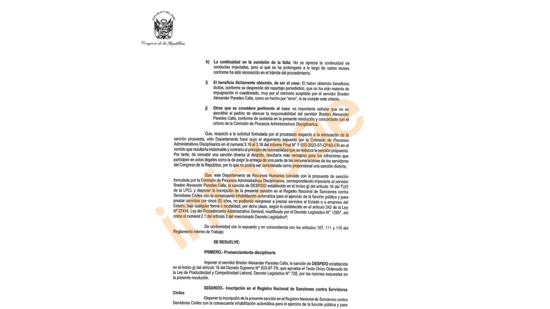 También se le sancionó con “la consecuente inhabilitación automática” para laborar en cualquier entidad pública y prestar servicios por cinco años. Paredes no podrá trabajar para ninguna empresa del Estado “bajo cualquier forma o modalidad”.