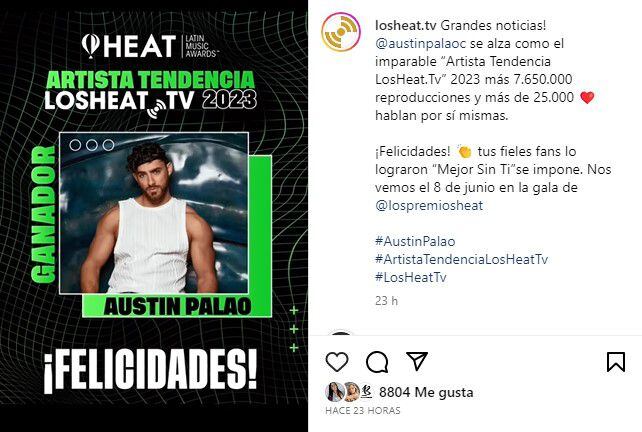 “¡Grandes noticias! Austin Palao se alza como el imparable ‘Artista Tendencia LosHeat. TV” 2023″, se lee en la cuenta oficial de los Premios Heat, dando por confirmado el triunfo de nuestro representante peruano. “Gracias a todos mis fans, familia y a los Premios Heat”, escribió el modelo en los comentarios.