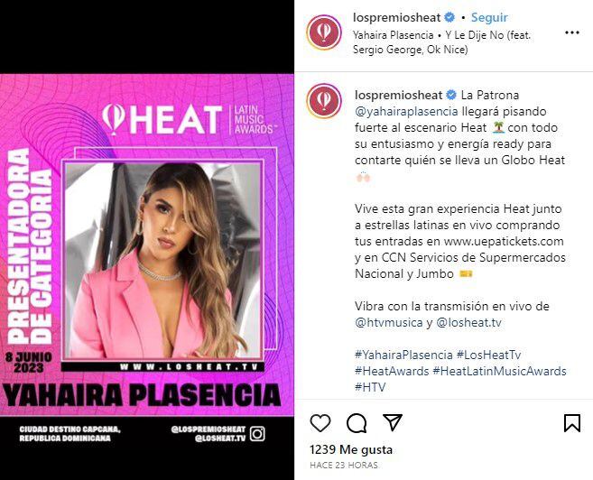“La ‘Patrona’ Yahaira Plasencia llegará pisando fuerte al escenario Heat con todo su entusiasmo y energía, ready para contarte quién se lleva un Globo Heat”, se lee como descripción en el post que publicó el Instagram oficial de la organización.