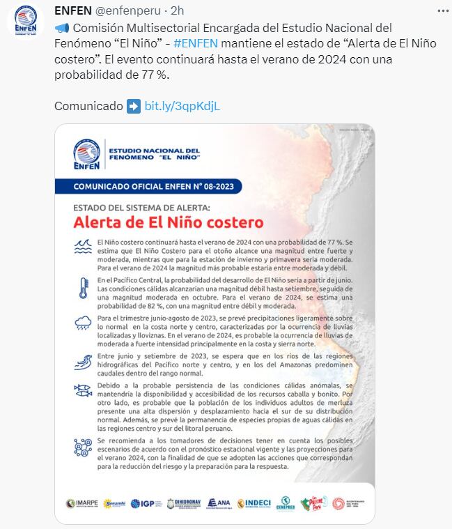 Como se recuerda el último reporte emitido por la Comisión Multisectorial Encargada del Estudio Nacional del Fenómeno “El Niño” (Enfen) afirma que “es más probable que El Niño costero continúe hasta el verano de 2024, en especial en la zona norte y centro del mar peruano, con una probabilidad de 77 %.