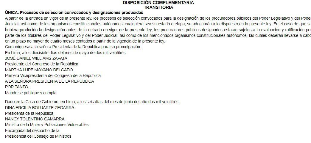 “A partir de la entrada en vigor de la presente ley, los procesos de selección convocados para la designación de los procuradores públicos del Poder Legislativo y del Poder Judicial, así como de los organismos constitucionales autónomos, cualquiera sea su estado o etapa, se adecuarán a lo dispuesto en la presente ley”, señala la disposición transitoria que está en la norma.