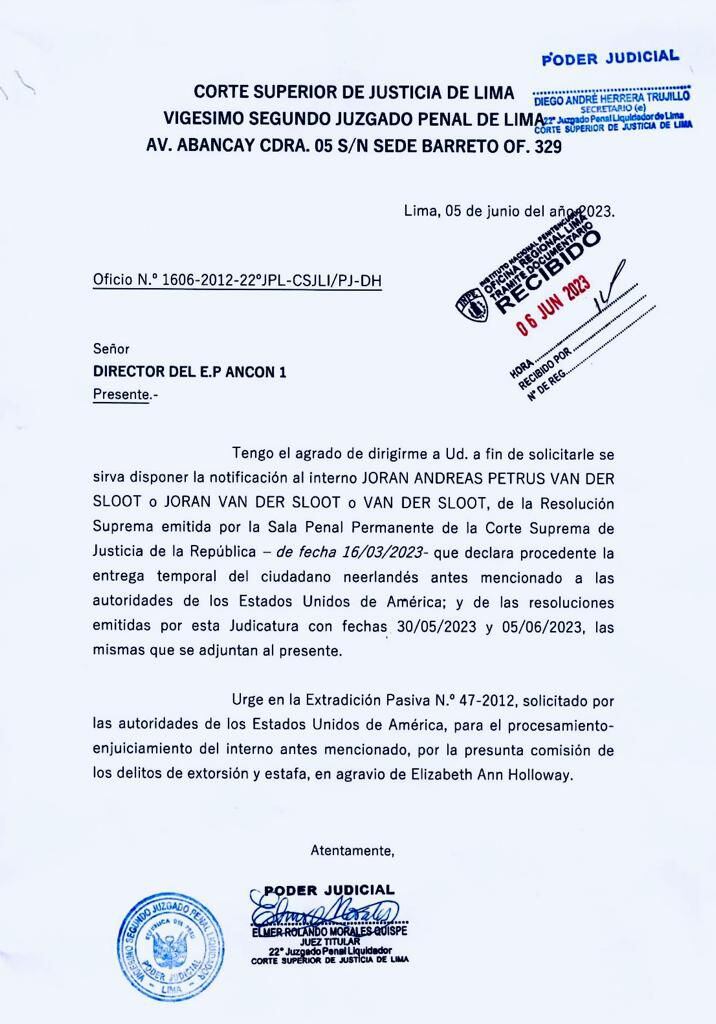 La Corte Superior de Justicia de Lima ya fijó la fecha de entrega del asesino holandés Joran Van Der Sloot a la Oficina de Investigación de Estados Unidos (FBI). Será este jueves 8 de junio, aunque el oficio firmado por Elmer Morales, juez titular del 22° Juzgado Penal Liquidador, no precisó la hora de la diligencia.