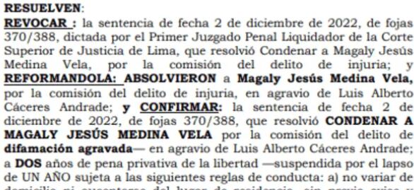 “Absolvieron a Magaly Jesús Medina Vela, por la comisión del delito de injuria, en agravio de Luis Alberto Cáceres Andrade (...) confirmar la sentencia de fecha 2 de diciembre de 2022 (...) que resolvió condenar a Magaly Jesús Medina Vela por la comisión del delito de difamación agravada”, dice el documento.