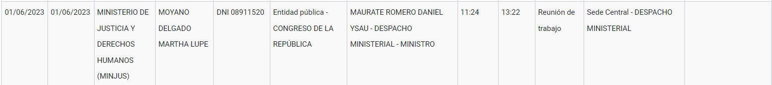 Antes de que la iniciativa legislativa vea la luz, hubo una cita entre la congresista Martha Moyano (Fuerza Popular) y el ministro de Justicia y Derechos Humanos, Daniel Maurate. El encuentro entre la vicepresidenta del Parlamento y el funcionario del Poder Ejecutivo se desarrolló el jueves 1 de junio pasado entre las 11:24 de la mañana y las 13:22 horas de la tarde.