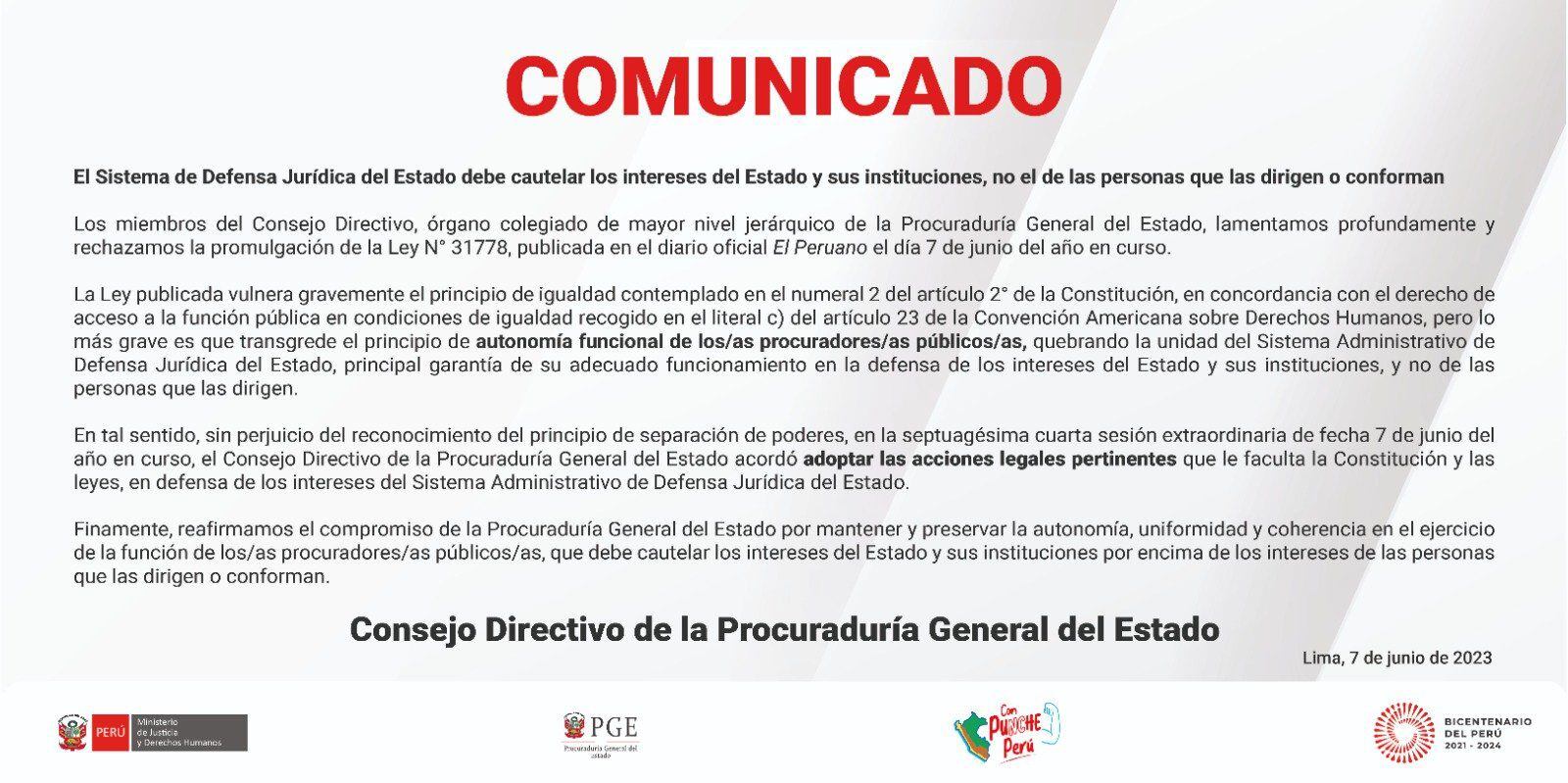 Tras la publicación de la norma la Procuradoría anunció que, tras sostener una reunión extraordinaria de su consejo directivo, tomará las acciones legales pertinentes debido a que atentan contra la autonomía que tiene como institución que le faculta la Constitución Política y el Sistema Administrativo de Defensa Jurídica del Estado.