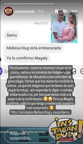 Fue entonces que Magaly Medina inició su programa del 7 de junio y afirmó que tenía la ‘bomba’ de que una persona del espectáculo estaba esperando un bebé, pero fue hasta más adelante que reveló que se trataba de Melissa Klug. De acuerdo a sus informaciones, la empresaria tiene 11 semanas de gestación.