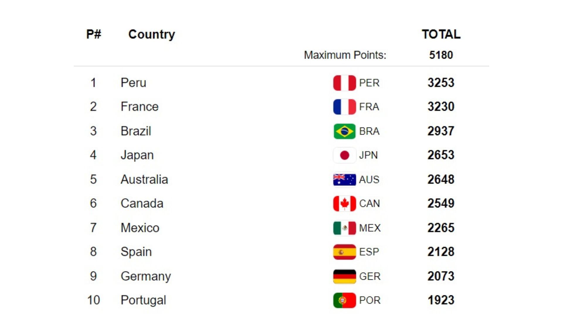 Los europeos se ubicaron en el tercer y cuarta lugar de la rama femenina, con lo cual quedaron subcampeones con 3230 unidades, dejando a Brasil como el último integrante del podio con 2937 de puntaje. Tan solo una corta diferencia entre peruanos y franceses que significó este prestigioso título.
