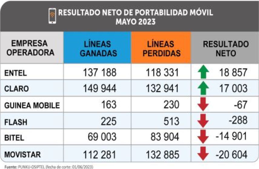Entel se mantuvo como la empresa operadora con el mayor saldo neto positivo (18,857) por segundo mes consecutivo, seguida de Claro, que registró 17,003 líneas móviles netas portadas en mayo.