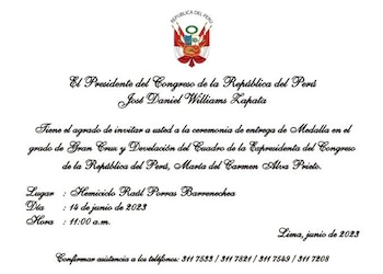 Alva, expresidenta de la institución, se apresta a recibir la insignia de Gran Cruz, un galardón para “los más destacados parlamentarios, los más altos jefes de las Fuerzas Armadas y las más altas personalidades ciudadanas”, y presenciar la develación de su cuadro, según la invitación difundida por Carlos Vigura, periodista de Al estilo Juliana.