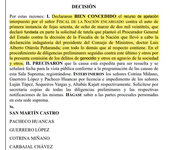 “El auto cuestionado es apelable porque produciría gravamen irreparable a la Fiscalía en su entendimiento de la realización de la declaración indagatoria de los investigados. Además, lo recurrió la parte legitimada (Fiscalía), se fijó en el recurso la pretensión procesal (causa de pedir y petitorio) con la incorporación de los argumentos fácticos y jurídicos correspondientes. El recurso se interpuso por escrito y dentro del plazo legal. Se ha cumplido los presupuestos procesales que rigen la admisión de los recursos”, resolvió la sala penal que preside el juez supremo César San Martín.