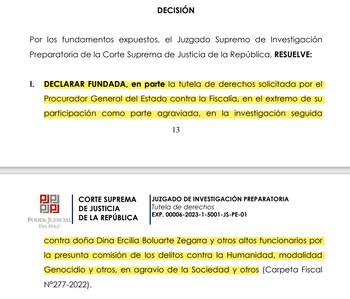 La Sala Penal Permanente de la Corte Suprema admitió a trámite la apelación de la Fiscalía de la Nación para que la Procuraduría General del Estado y los abogados de los deudos de fallecidos en protestas no puedan interrogar a la presidenta Dina Boluarte y al presidente del Consejo de Ministros, Alberto Otárola.